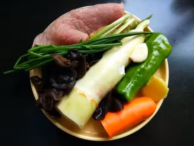 【魚香茭白的食材】:茭白一根,胡蘿蔔一小段,青椒一個,泡發木耳適量,裡脊肉150g ,泡辣椒適量,生薑一塊,大蒜三瓣,香蔥適量。