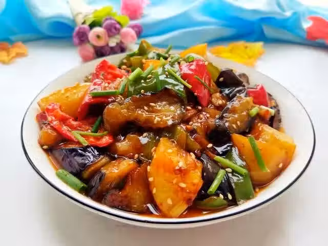 4.放入辣椒翻炒,放入土豆,茄子,淋入魚香汁,放胡椒粉 雞精,撒上白芝麻,香蔥,魚香地三鮮就做好啦!
