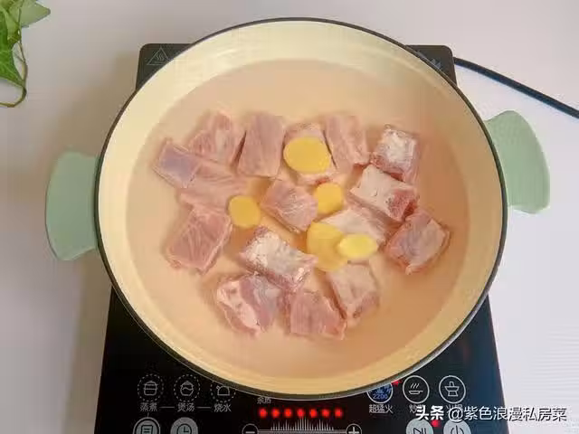 4.鍋中放清水,放幾片生薑,一勺料酒,排骨冷水下鍋,焯水撈出沖洗乾淨。