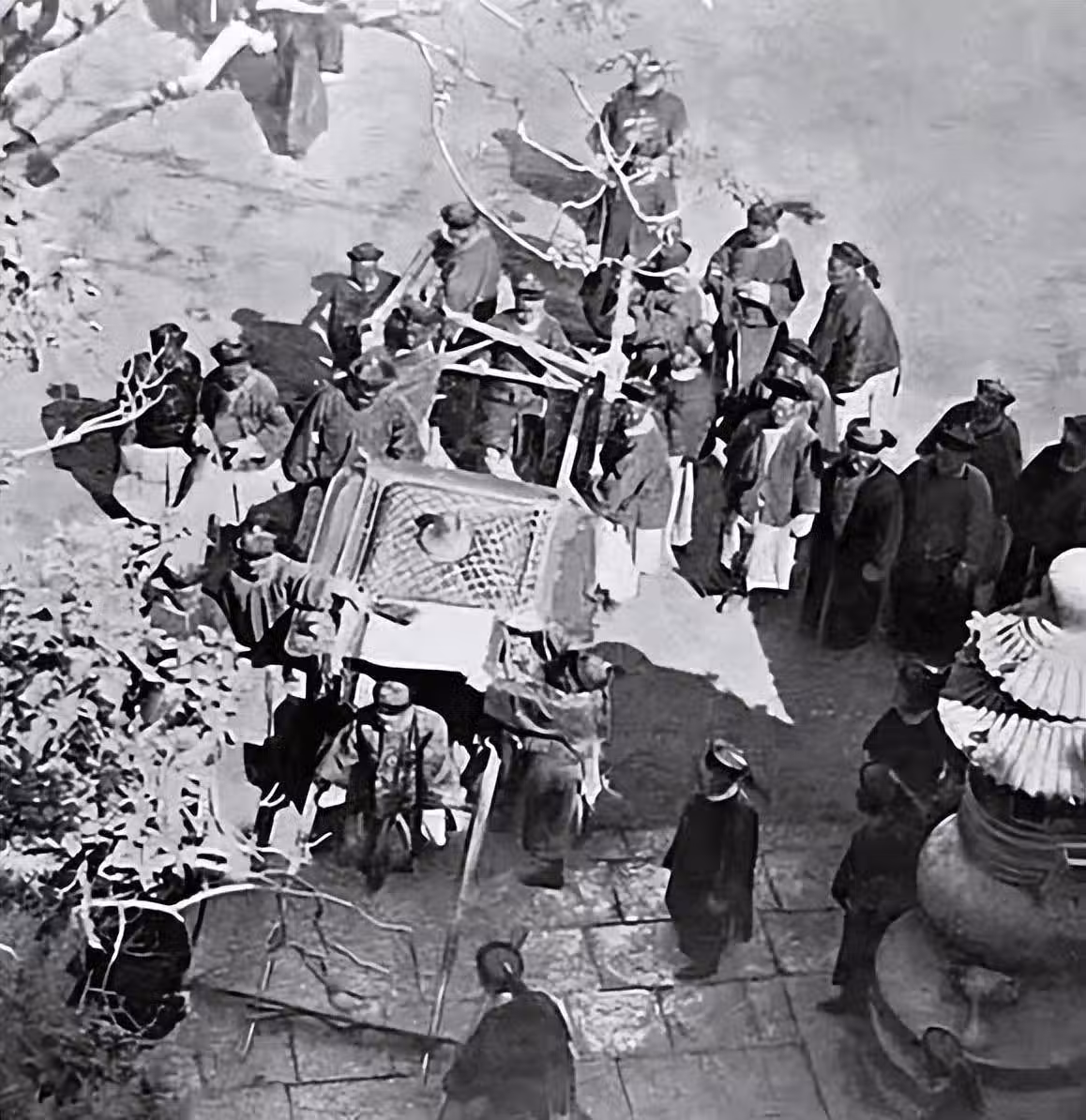 這張照片拍攝於1902年1月8日,「兩宮」從西安回到北京。據《德宗實錄·卷四十九》記載,「上奉慈禧端佑康頤昭豫莊誠壽恭欽獻崇熙皇太后自保定府御火車啟鑾。未刻至京師,詣正陽門關帝廟、菩薩廟拈香還宮。」