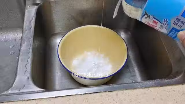然後,我們準備一些開水,把開水倒到溶液裡面,如果家裡房間裡有熱水,也可以把熱水調到最高,再放出來,開水的溫度比較高,同樣可以溶解油污,洗碗的朋友都知道,每次洗碗的時候,如果油污不易清潔出來,只要加入熱水來洗,就可以輕鬆清潔油污。