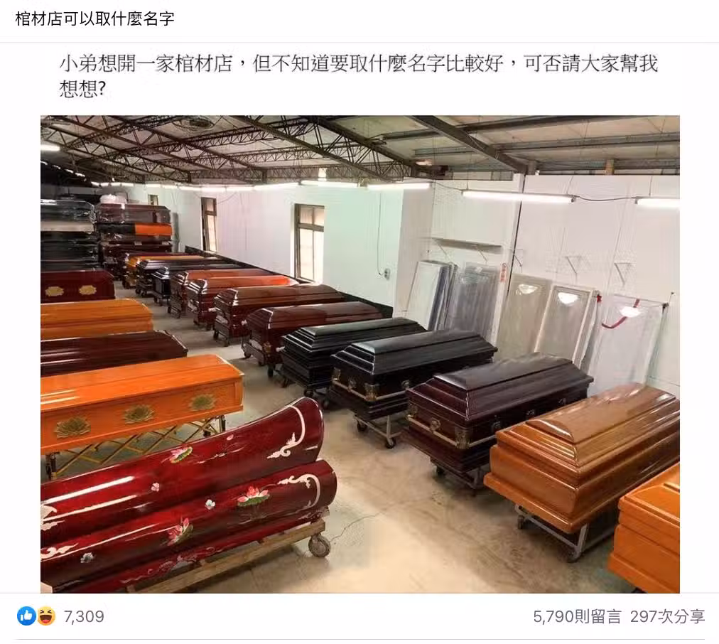 大家一起動動腦!他上網問「開棺材店怎麼取名」網蓋樓出招 超強網友「4字店名被讚爆」狂吸上千讚