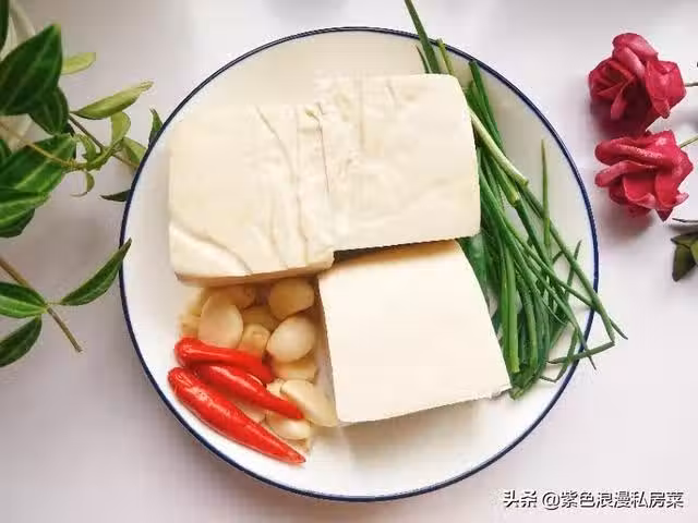 1.準備食材,我買的是老豆腐,朋友們也可以買北豆腐,北豆腐含水量高一點,口感嫩一些。