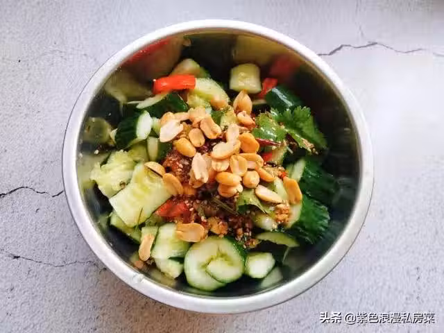 步驟五:將做好的涼拌汁倒入黃瓜中,放入熟花生米,拌勻就可以啦!