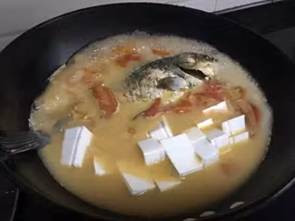 4.水燒開後用中火煮八分鐘,八分鐘後將準備好的豆腐塊放進去。放入三克精鹽,兩克胡椒粉。蓋上蓋子繼續燉五分鐘就可以出鍋啦。