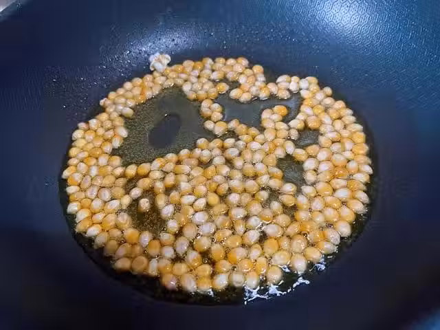 2、用鏟子攪勻、鋪平,使玉米粒全部鋪在一個平面上。轉中小火,用鏟子不停地翻動,當看到有幾顆玉米粒已經爆出花後,立刻蓋上鍋蓋。