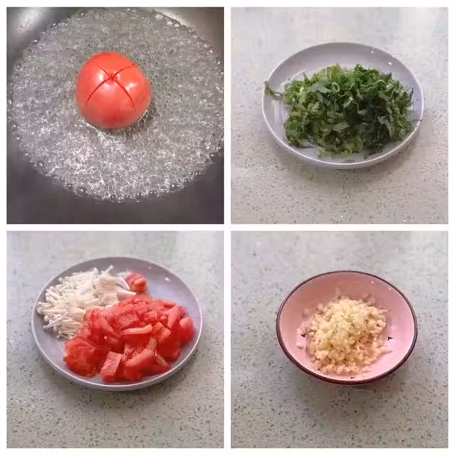2、鍋內加適量的油,倒入蒜末爆香,然後將西紅柿丁放入鍋中翻炒,炒至西紅柿出水,然後放金針菇段翻炒均勻,加適量的生抽調味,接著倒入適量的溫水,大火燒開。