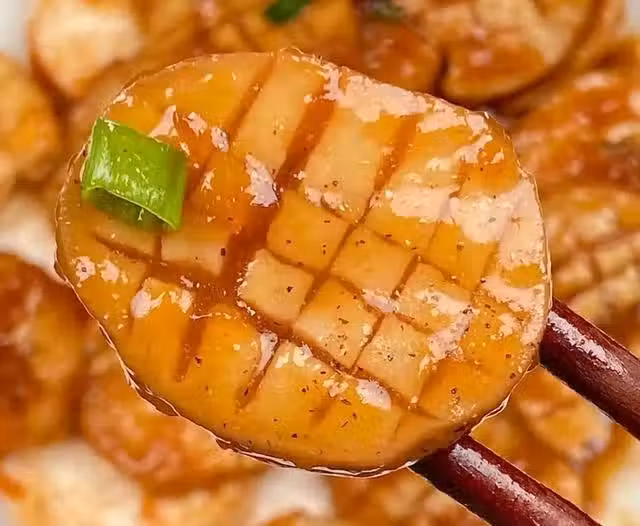 (3)鍋中熱油,下入杏鮑菇,煎至兩面金黃色,倒入調好的醬汁,大火翻炒均勻,至湯汁濃稠關火收汁。