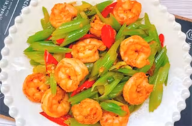 步驟三:鍋中燒油,下入蔥、姜、蒜、小米辣爆香,倒入蝦仁翻炒至變色,再倒入芹菜段,加一勺生抽、少許鹽,翻炒均勻即可出鍋。清脆爽口,富含膳食纖維,小孩子可以多吃。