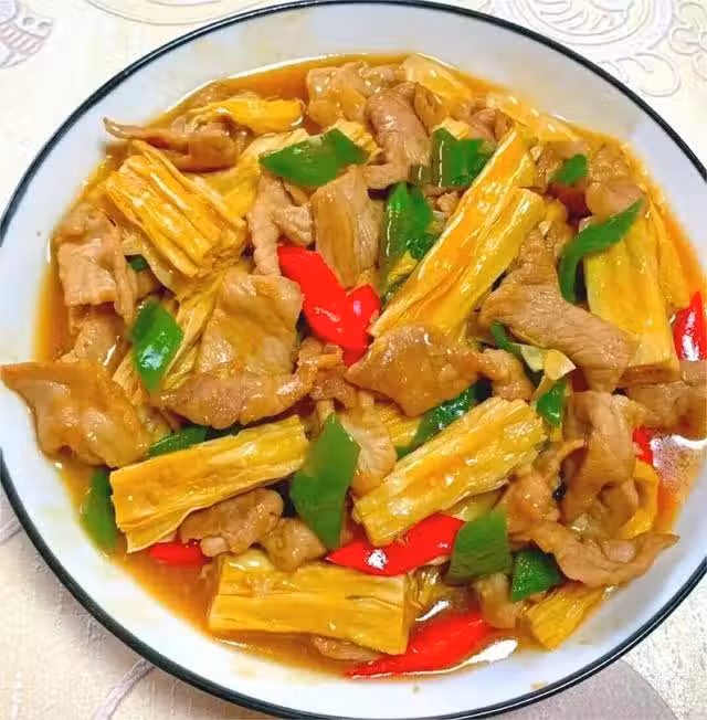 步驟三:鍋中燒油,把肉片下鍋翻炒至變色,倒入蒜末炒香,再把腐竹、青紅椒片下鍋,加一勺生抽、少量鹽、雞精調味,在淋入一勺水澱粉,咕嘟至入味即可出鍋。