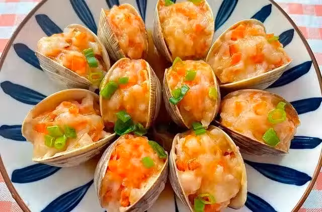 步驟二:蝦滑中加入胡蘿蔔碎,攪拌均勻,把蝦滑擠入蛤蜊的開口處,擠滿,上鍋蒸十五分鐘左右,蒸好的蝦滑撒上蔥花,淋上熱油,淋點海鮮醬,美味即成。鮮嫩可口,非常的好吃,大人孩子都愛吃。