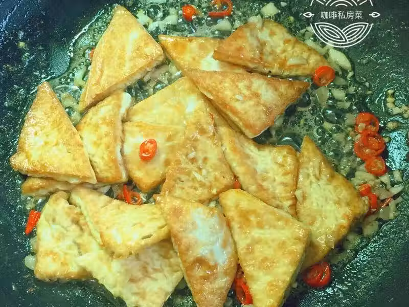 炒鍋燒熱入油,放入豆腐小火煎,不要急於翻面,要耐心等著煎得金黃再翻面。