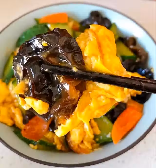 步驟三:鍋中留底油,爆香蔥姜,先放入胡蘿蔔炒軟,再放木耳、黃瓜翻炒,加入兩勺生抽、一勺蚝油、少許鹽、雞精、白糖,翻炒均勻,最後放入雞蛋炒勻,淋入一些水澱粉,翻炒均勻即可出鍋。