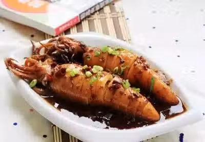 原料:魷魚,生薑,大蒜,干辣椒,八角適量,小蔥一根,色拉油,冰糖,料酒,醬油,味精適量。
