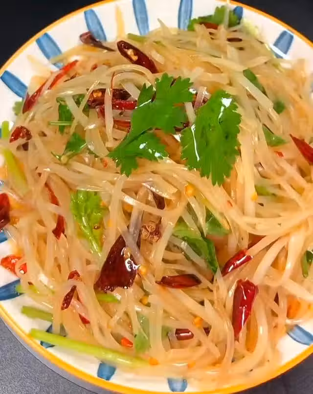 步驟一:土豆要選擇那種脆土豆,顏色較淺的就是脆土豆。土豆洗凈削皮,再切絲,再次清洗乾淨其中的澱粉,撈出控水。青椒處理乾淨,切絲,香菜切碎,備用。