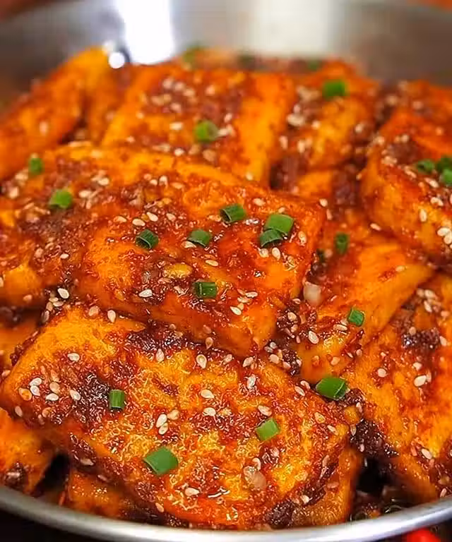 步驟三:鍋中燒油,油熱把豆腐塊下鍋煎至兩面金黃,把調好的料汁淋入豆腐上,攪拌均勻即可。