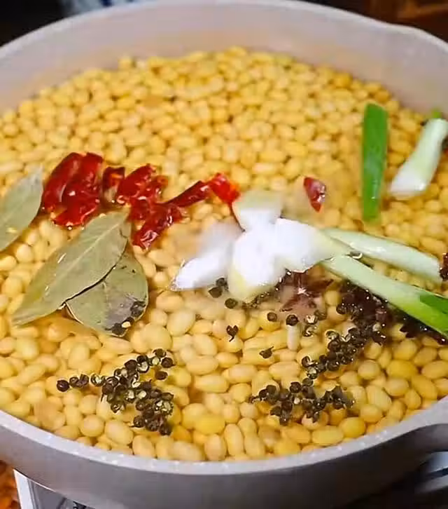 步驟三:起鍋燒油,把黃豆下鍋,炒干黃豆的水分,加一勺黃豆醬、一勺豆瓣醬,再次翻炒出醬香味,倒入姜蒜辣椒末,炒干辣椒末中的水分,倒入一勺白芝麻、一勺白糖、適量的雞精,再次翻炒兩分鐘即可。