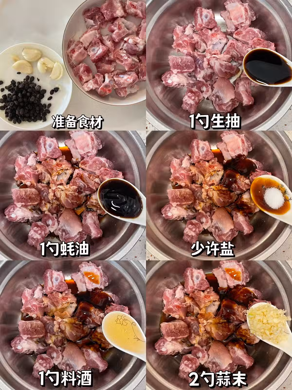 ➕1勺生抽➕1勺蚝油➕少許鹽➕1勺料酒➕2勺蒜末➕1勺半生粉➕2勺豆䜴,抓均勻後➕2勺油再抓均勻,腌制20分鐘