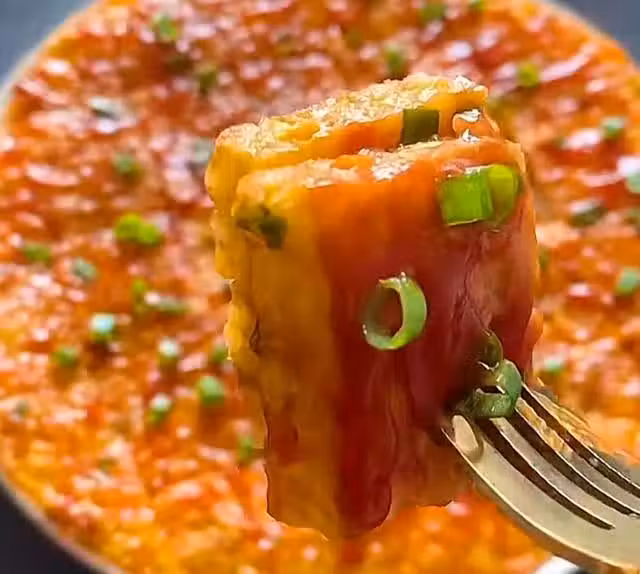 步驟三:把米飯雞蛋倒入平底鍋中,小火慢煎,翻面,兩面都煎至金黃,想吃焦脆的,多煎一會兒。刷上一層番茄醬,撒點小蔥花,更好吃了。剩米飯這樣吃,不浪費還特別香,孩子特別愛吃。