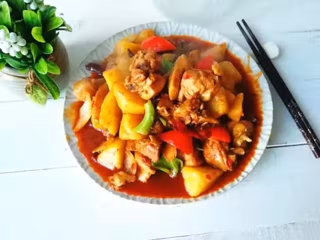 6.下入土豆塊,繼續燉制,將土豆燉制熟透,加入鹽調味,下入尖椒,紅椒,洋蔥,翻炒均勻,盛出裝盤即可