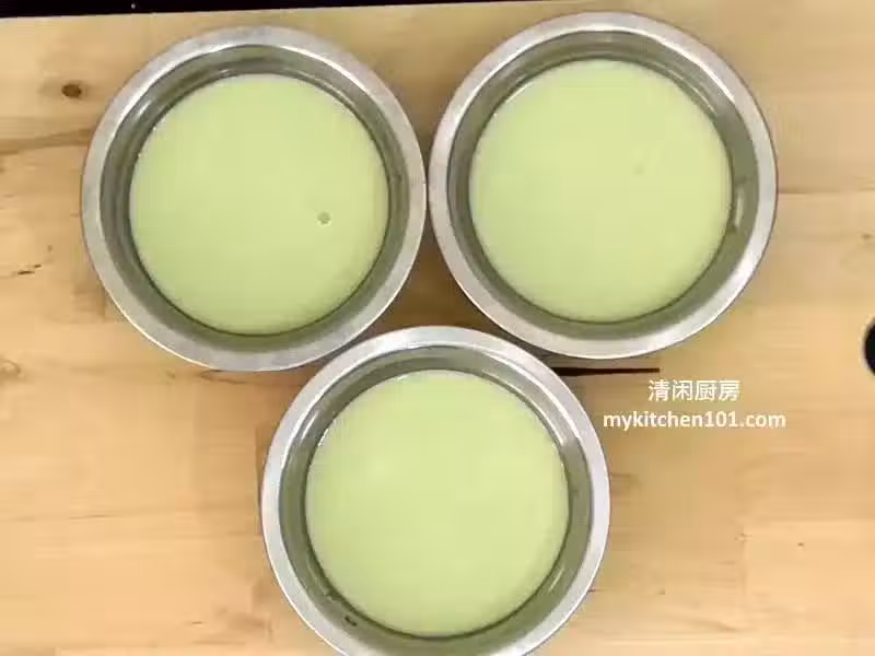 3 藍色層: 把清水、蘭花汁、糖、鹽和香蘭葉混合,加熱至糖完全融化。冷卻後,取出香蘭葉,加入椰奶和所有粉類拌勻後過篩。把藍色粉漿分成3等份備用 (每份約160 克)。