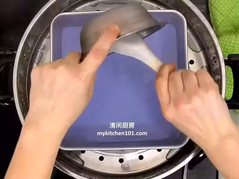 5 重複步驟,至到蒸完所有粉漿。倒入最後一份粉漿後,以大火蒸4分鐘,然後調至中火繼續蒸10分鐘。