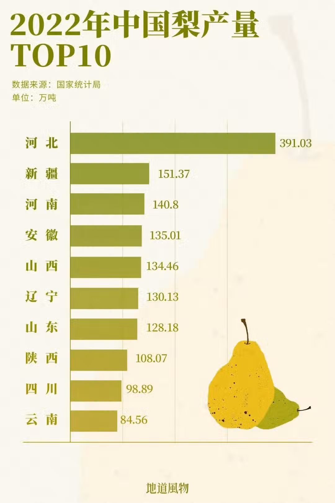 口味是主觀的,但從客觀的數據來看,北方梨的產量依然遙遙領先於南方。