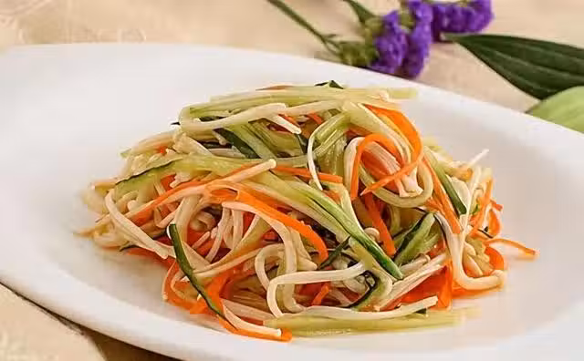 將豆腐皮切成細絲,黃瓜切成細絲,胡蘿蔔切成細絲,然後加豆腐皮放進開水中焯上一分鐘,這樣就能夠去除它的豆腥味。
