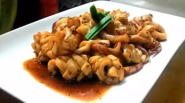 3.油炒一下醬料後倒入燙好的魷魚,快速翻炒,快速放入紅椒和蔥,加少許糖和料酒,翻炒,起鍋。