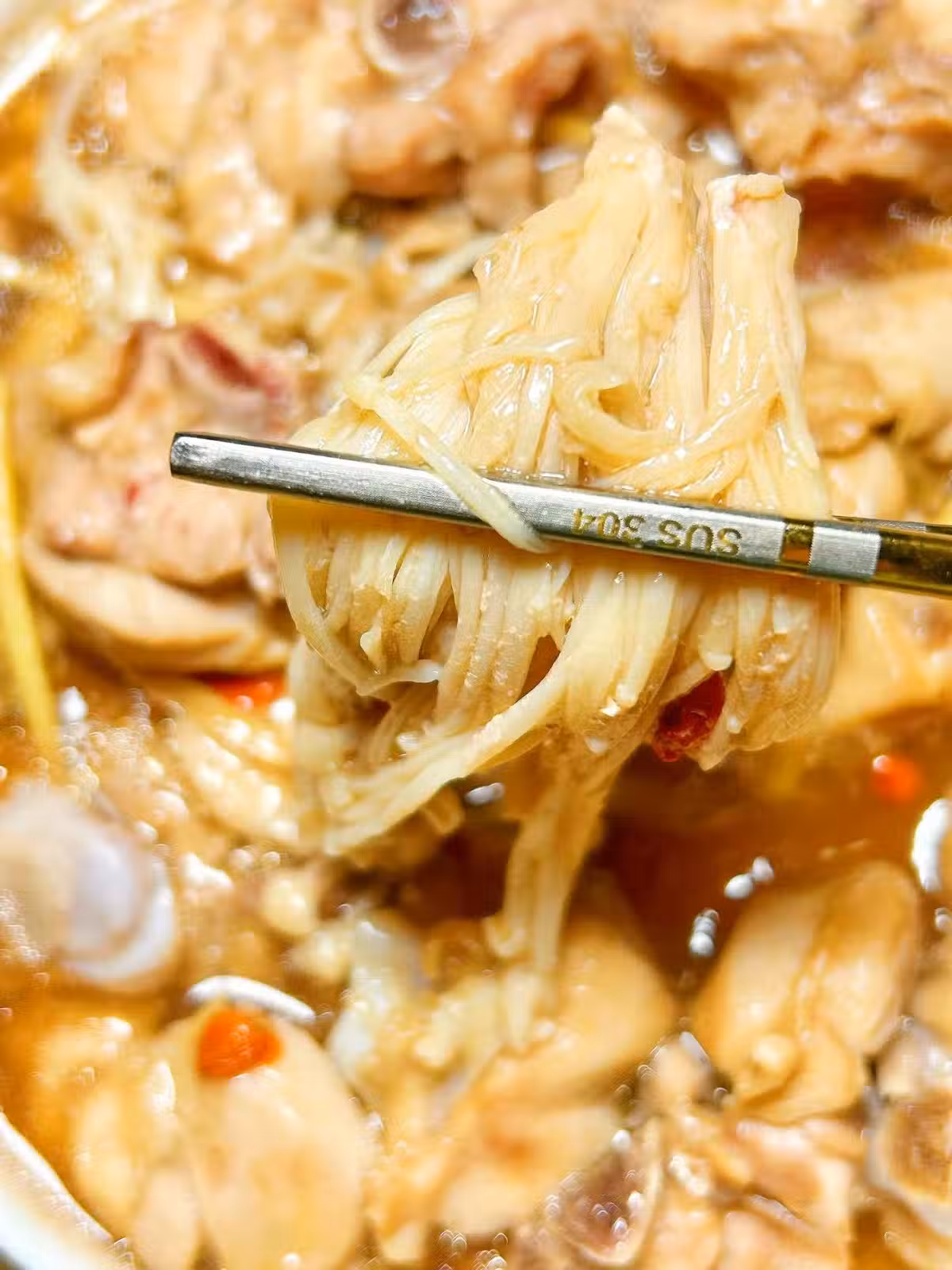 [一R]金針菇洗凈備用,雞腿剁塊腌制:薑絲➕少許鹽巴➕一勺料酒➕一勺生抽➕一勺蚝油➕少許胡椒粉➕一勺澱粉➕少許白糖,抓拌均勻腌制30分鐘