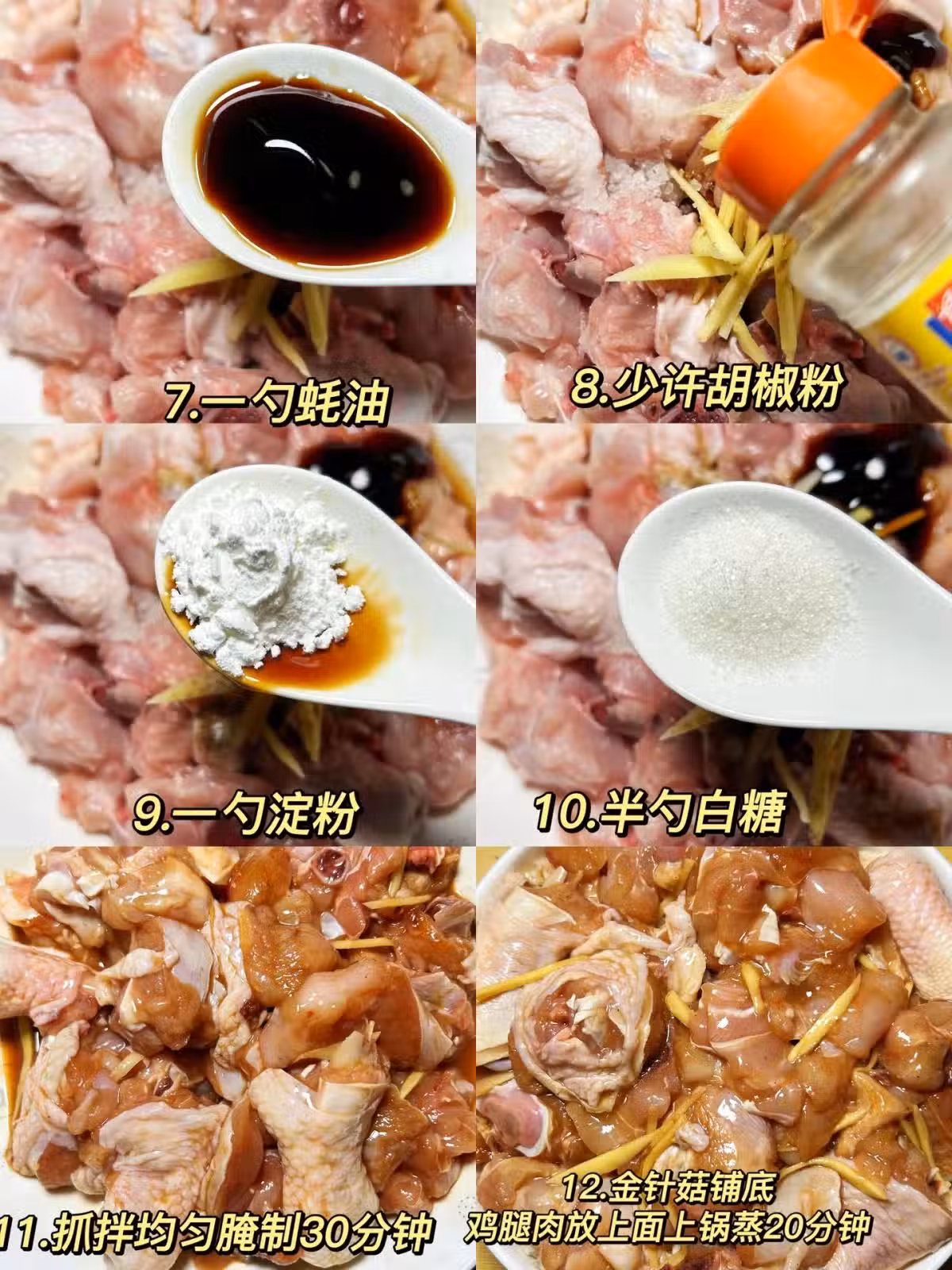 [一R]金針菇洗凈備用,雞腿剁塊腌制:薑絲➕少許鹽巴➕一勺料酒➕一勺生抽➕一勺蚝油➕少許胡椒粉➕一勺澱粉➕少許白糖,抓拌均勻腌制30分鐘