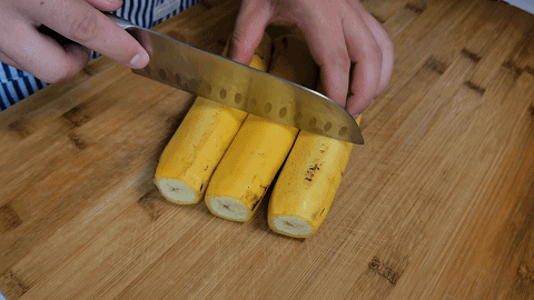 1.把香蕉切去頭尾,再切成長段,然後剝去香蕉的外皮,帶皮切的香蕉不易破損,做好的炸香蕉成型更好看。