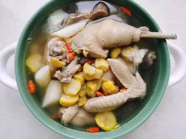 【所需材料】:老母雞1隻、鐵棍山藥1根、板栗10顆、生薑1小塊、枸杞適量、料酒1勺、鹽適量、雞精適量