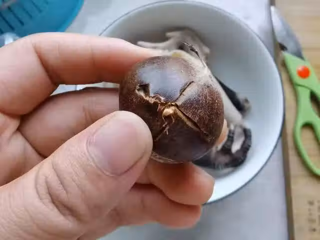 4.板栗先清洗乾淨,洗凈後用刀把板栗背面磕出十字,也可以用剪刀剪出十字,如果用刀的話要用手拍刀背慢慢的磕,以免劃傷手。