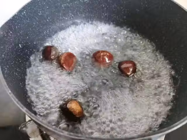 5.鍋里燒開水,水開之後下入板栗入開水中煮2分鐘,把板栗煮熟。