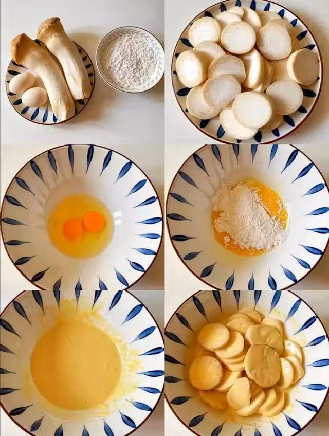 杏鮑菇兩個,雞蛋兩個,麵粉50克,土豆澱粉50克,椒鹽粉適量,辣椒粉適量,食用油。