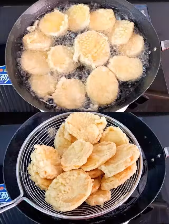 雞蛋打散,加入麵粉、土豆澱粉、適量清水攪拌成糊狀,放入杏鮑菇片裹上面糊。