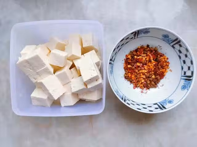 1. 把大豆腐切小塊,大小為1厘米見方就可以。花椒和干辣椒混合碾碎,碾碎的花椒和干辣椒能大大提升麻婆豆腐香熱麻辣的口感。