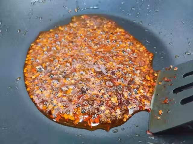 3. 鍋中倒少許油,把搗碎的花椒碎和干辣椒碎倒入,小火慢炒煸出香味,盛出備用。