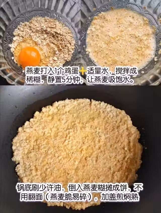 4鍋底刷少許油,倒入燕麥糊攤成餅,不用翻面(燕麥脆易碎),加蓋煎燜熟。
