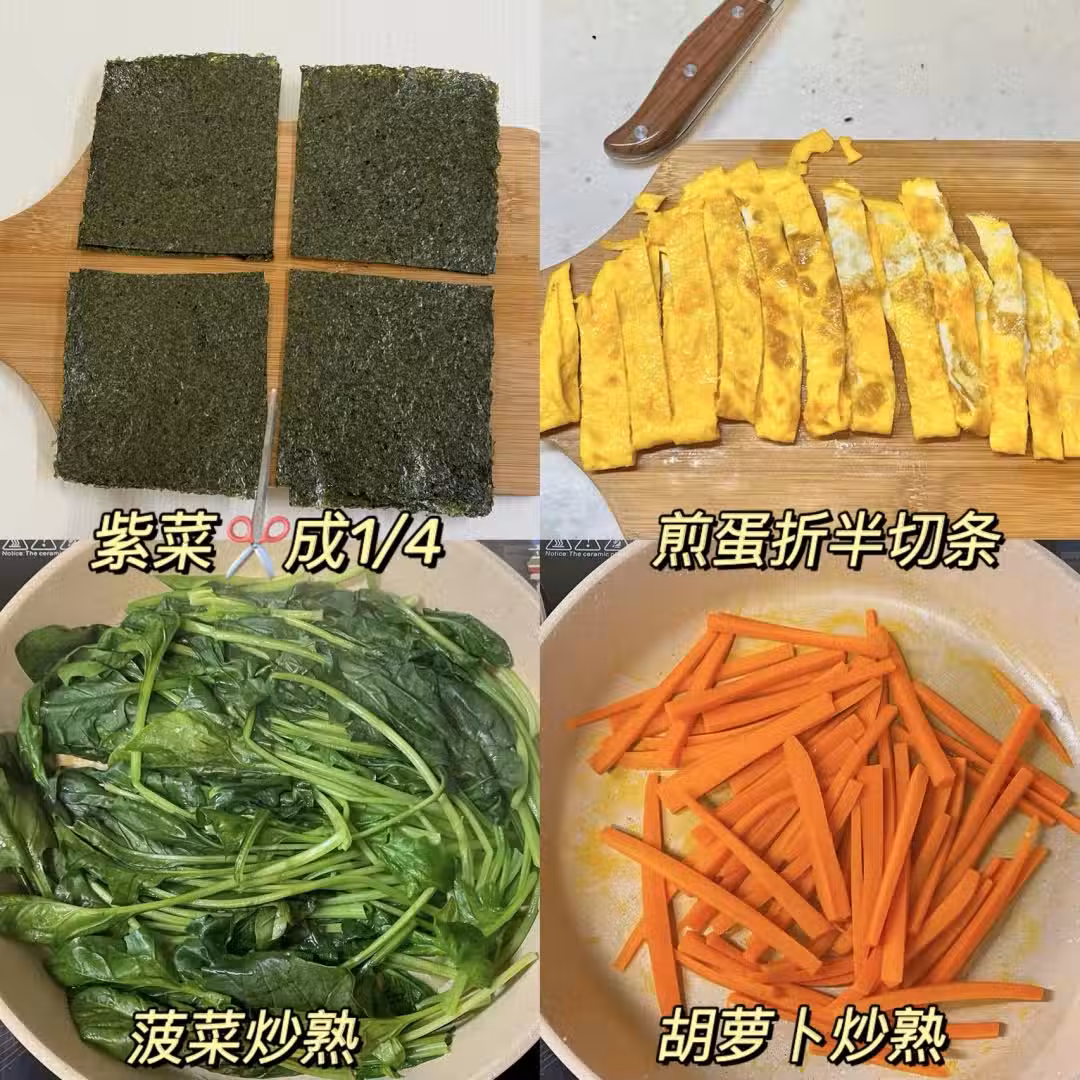 2⃣️將紫菜✂️成規格為1/4的小紫菜!熱鍋煎好雞蛋