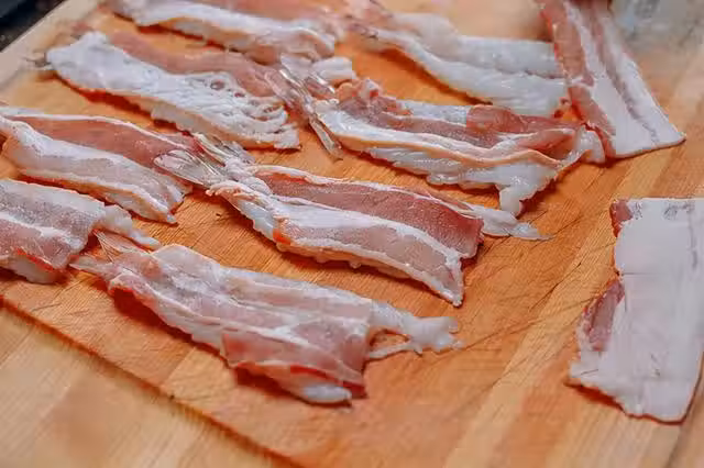往蝦上撒上適量的鹽調一下味,然後把切好的培根鋪在蝦上面。