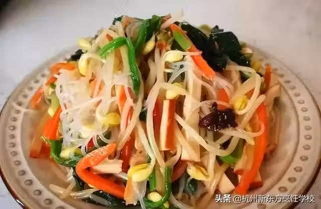 食材:豆芽、胡蘿蔔、菠菜、粉絲、五香豆腐乾、海鮮醬油、醋、蚝油、蔥油、辣椒油、鹽