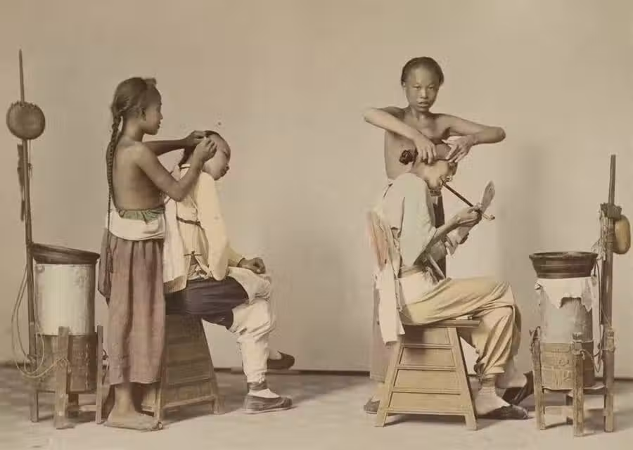 1900年廣州,兩名富家子弟正在坐一個獨輪車,他們衣著干凈,拿著鵝毛扇,看似很愜意,但拉車的人由於經常在太陽下暴曬,皮膚已經黝黑。
