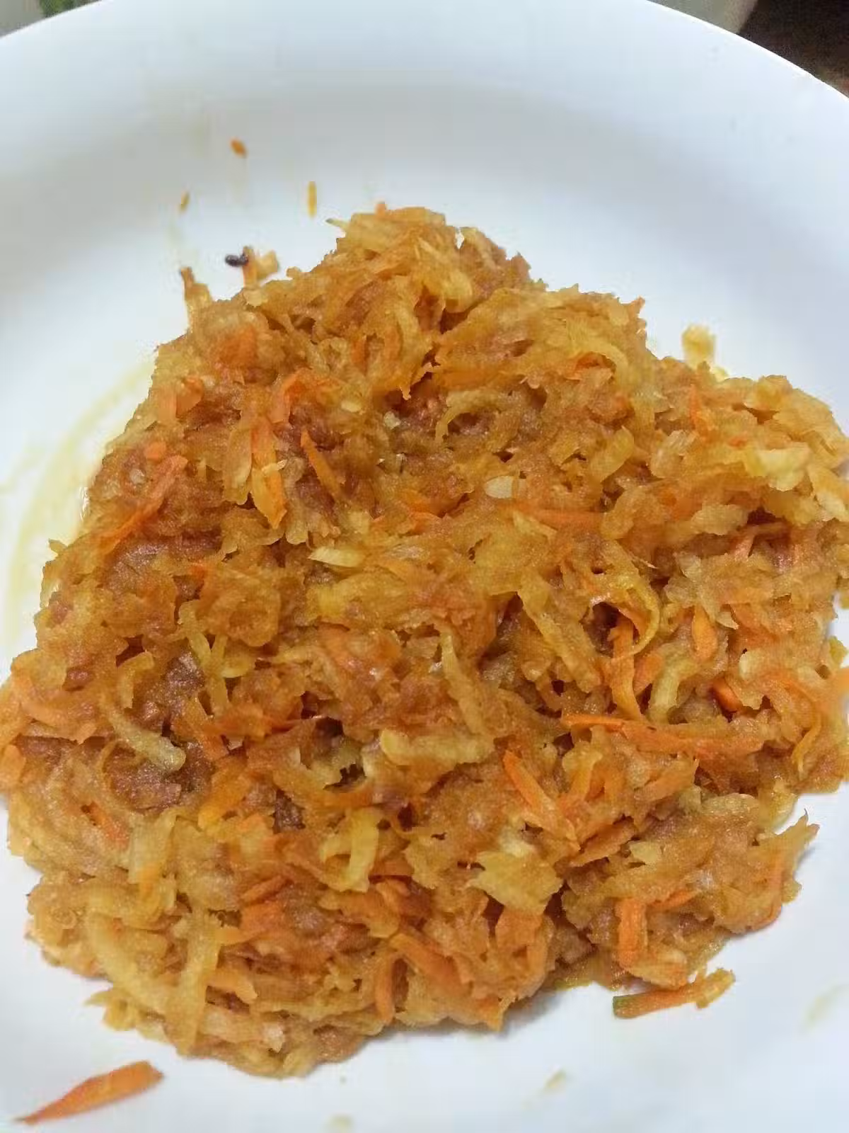 1、燒熱油, 爆香蒜末, 加入沙葛絲, 紅蘿蔔絲炒軟。