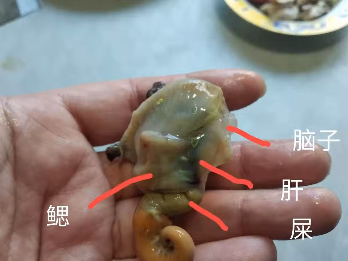 海螺的腦子其實很好找,就是在螺頭下方的位置,特別軟的一小塊,煮熟後輕輕一擠就可以輕松去除,海螺的肝是綠色的只要摘除就可以,海螺的鰓也很好分辨,尾部綠色的部位也很好分辨,這些去除以後就可以放心食用。