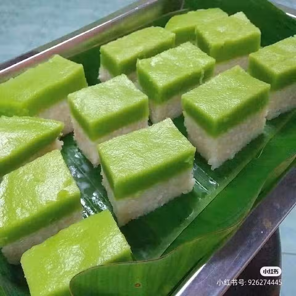 下層材料:麵粉 1杯,椰漿 2杯,砂糖 1.5杯,水 半杯,玉米粉 1大匙,雞蛋 1粒,鹽 少許