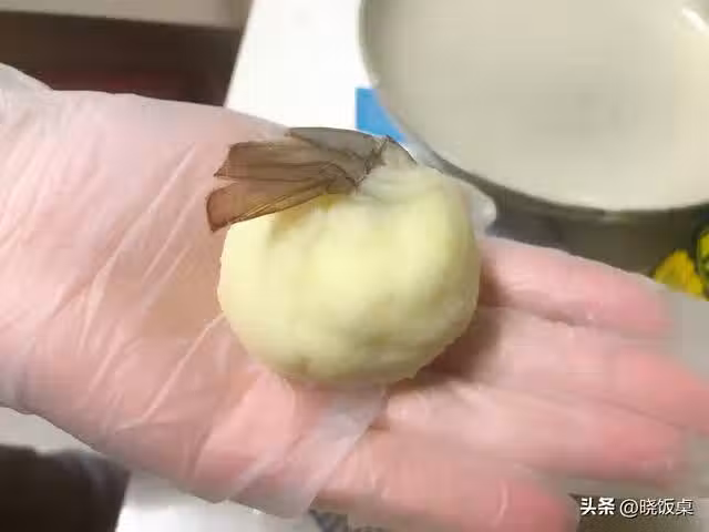 5、起鍋燒油,等油溫5成熱以後,先用蝦球粘滿一層雞蛋液,接著再裹滿一層麵包糠,最後放入油鍋中,小火慢炸。