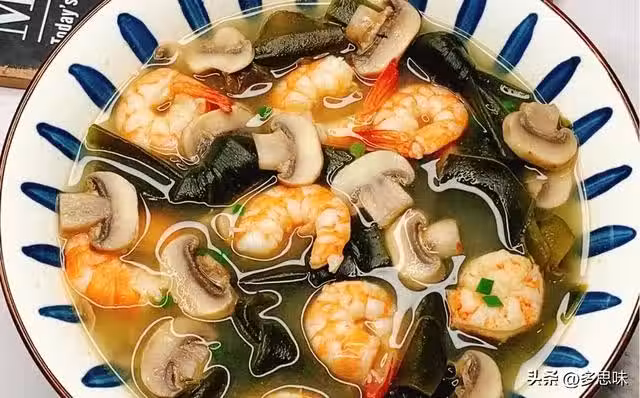食材:蝦,海帶,蘑菇,蒜,鹽,胡椒粉,料酒,蔥