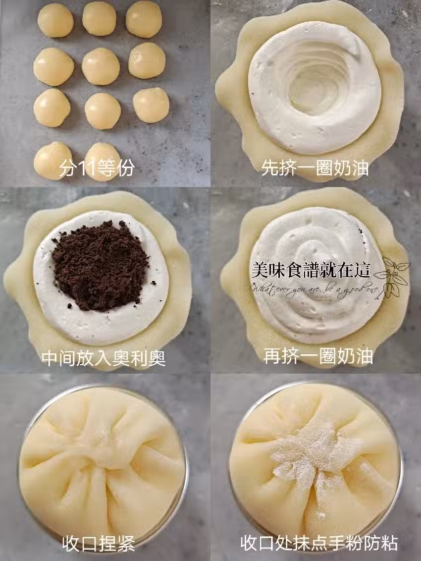 [四]將揉好的麵糰分成11個劑子,撒熟粉防粘,擀成中間厚兩邊薄的麵皮,麵皮放入模具內,先擠一層奶油,加入奧利奧碎,再擠一層奶油,提起四周收口收緊,收口處沾點手粉防粘,放入冰箱冷藏定型1小時,就ok啦!!試試吧,真的超級好吃。
